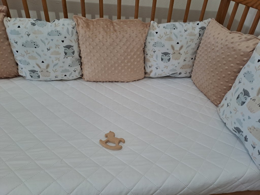 1 - Polštářkový mantinel na polovinu postýlky -1 polštářek rozměr 30 x 60 do čela postýlky , 4 polštářky rozměr 30 x 30 cm na boky postýlky.