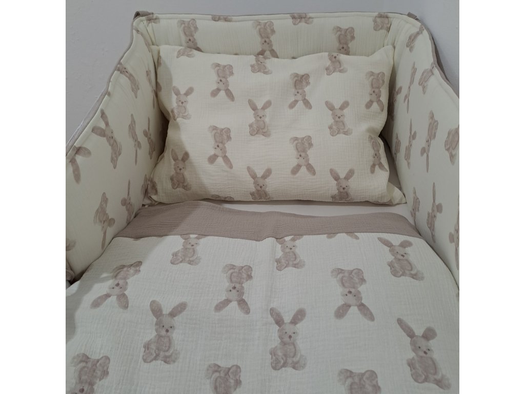 - Z jedné strany jednobarevný mušelín a z druhé strany mušelín se zajíčky.