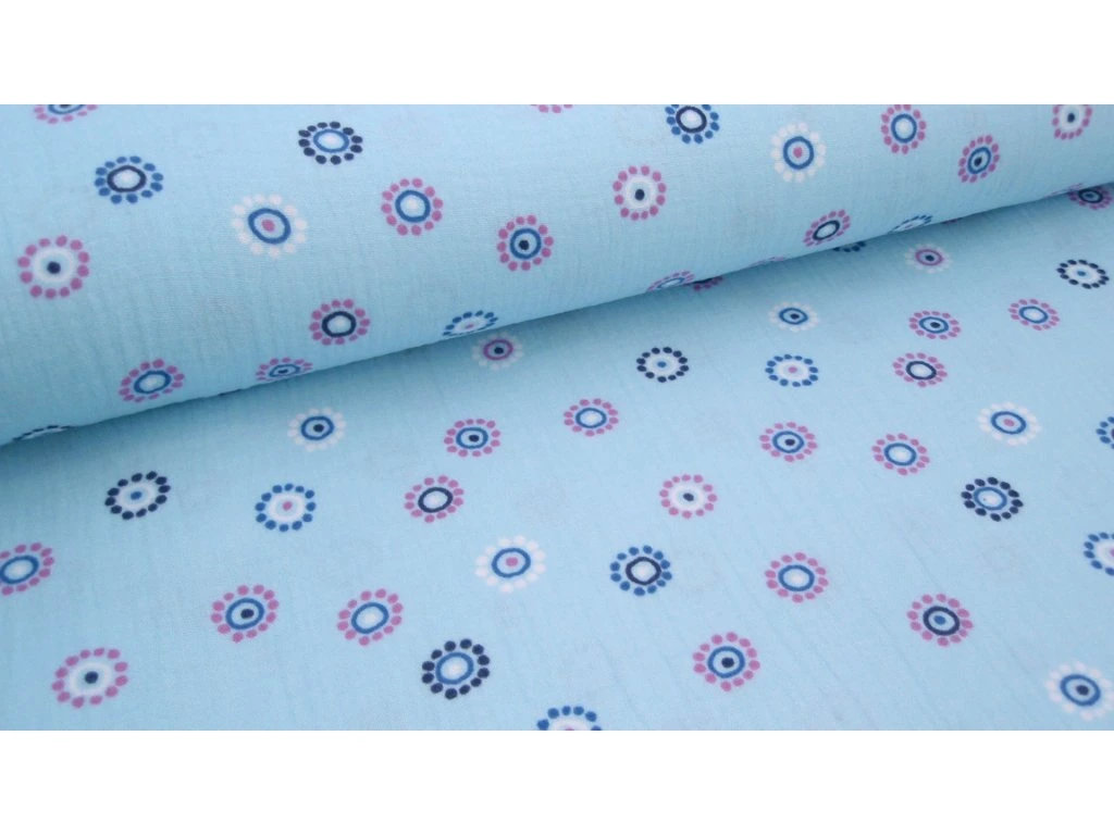 Mušelín - gázovina - v modré barvě s potiskem barevných koleček.