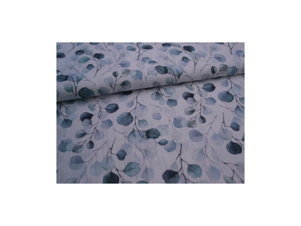 Mušelín - gázovina - v bílé barvě s nádherným digitálním potiskem lístků v pastelových zelenkavých odstínech.
