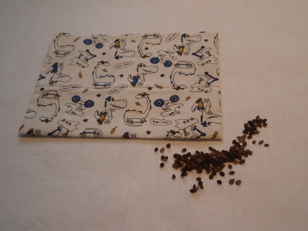Vnitřek polštářku - potah je z bílé 100% bavlny.Náplň pohankové slupky cca 100 g. Nesmí se prát!!