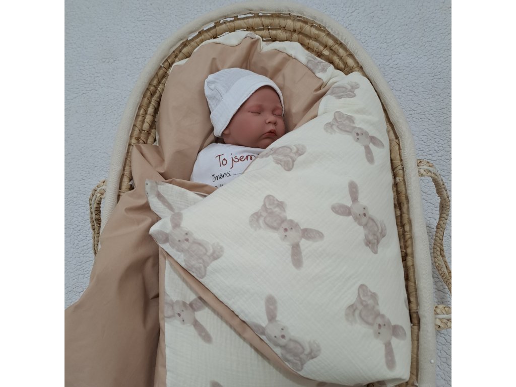 - Vrchní díl je z bavlněného mušelínu s motivem zajíčků a capuccino vnitřek je ze 100% bavlny.