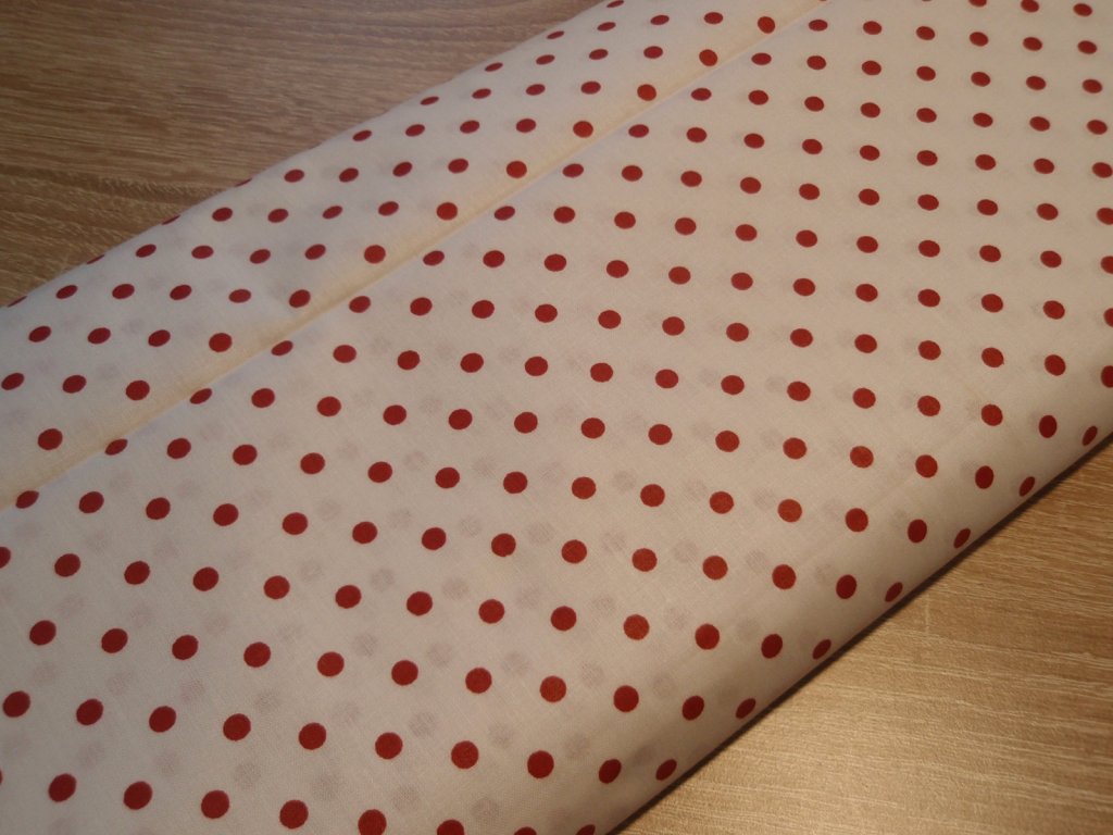 Bílá bavlněná látka s červenými puntíky - velikost puntíků cca 4 mm.
